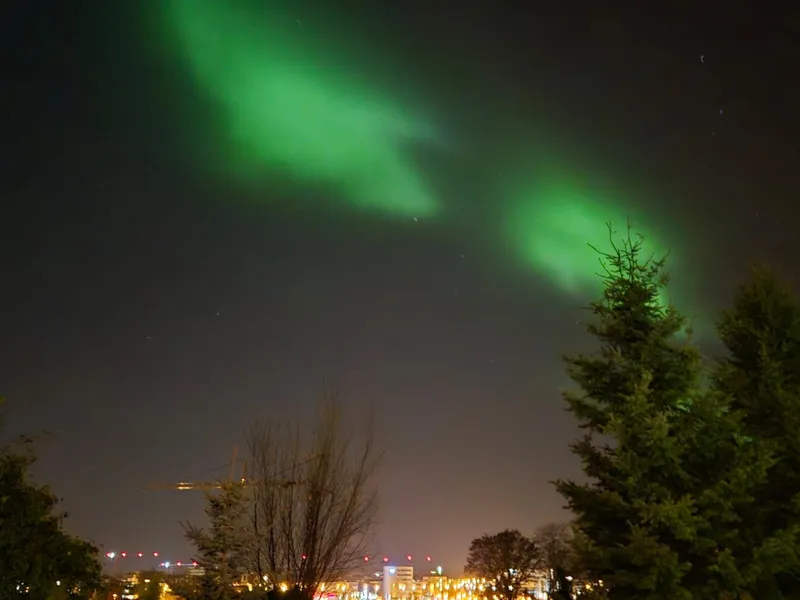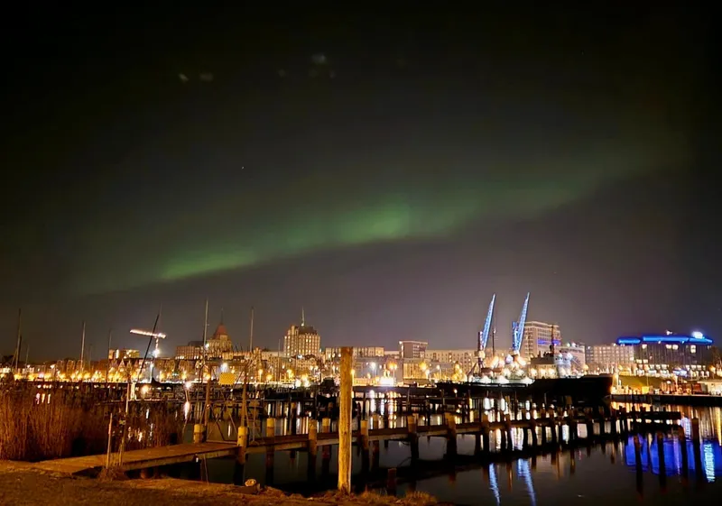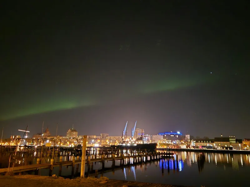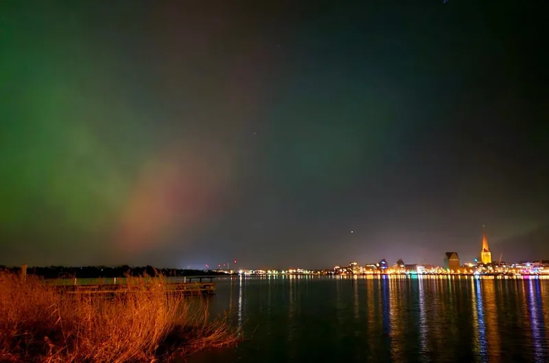 Polarlichter sind normalerweise in den Polarregionen zu sehen, können aber bei starker Sonnenaktivität auch weiter südlich auftauchen – aktuell sogar über Rostock. Sie entstehen, wenn geladene Teilchen von der Sonne auf Sauerstoff in der Atmosphäre treffen und diese kurzzeitig zum Leuchten bringen. Besonders das grüne Licht wirkt intensiv, weil es in niedrigen Höhen von etwa 100 bis 120 Kilometern entsteht und unser Auge dafür besonders empfindlich ist.